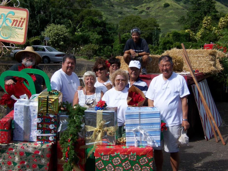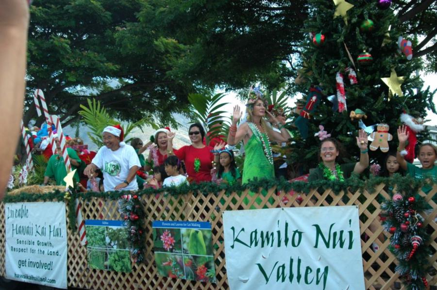 11-29-08 Livable Hawaii Kai Hui celebrated in the Hawaii Kai Lion's Club Holiday Parade to help kick off the Season. Our Xmas float was decorated with plants and colorful arrangements from the Kamilo Nui Valley. Our lead car was a classic roadster that transported the original farmers from Kamilo Nui Valley. The presentation was enjoyed by local residents that lined the sidewalks of Lunalilo Home Road. The parade ended at Koko Marina Shopping Center where many more festivities were taking place. Livable Hawaii Kai Hui would like to thank all the community members and supporters that donated their time and supplies to build the large float.
