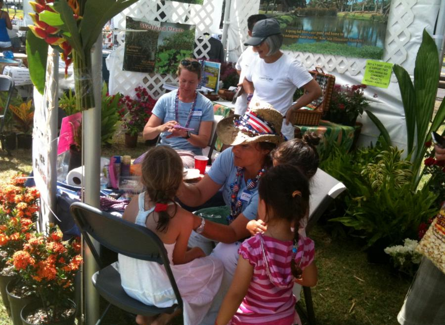YouTube Slideshow - 2011 IDMBF Slideshow.mpg also CAPTIONED SLIDESHOW (may take a few seconds to load). LHKH had 2 tents at the IDMBF event. One tent featured the wetland at the Oahu Club and the other tent featured the Kamilonui Valley Farmers and Aloha Aina O Kamilonui. To learn more about these projects go to our Wetlands Page and www.kamilonuivalley.org . Our volunteers also showcased their artistic talents by facepainting the children. Kamilonui Valley plants decorated our area and were also for sale!