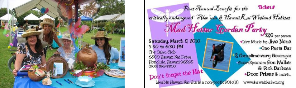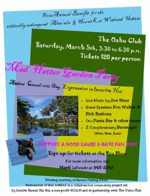 9-4-10 - Sept. 4th (Saturday), from 3:00 - 5:30 PM Join us at the Mad Hatter Tea Party, a gathering to benefit the Hawai'i Kai wetland project at the O'ahu Club. RSVP to Kaumaka Wong at kaumakawong@yahoo.com or #221-0555. $15.00 per person.
