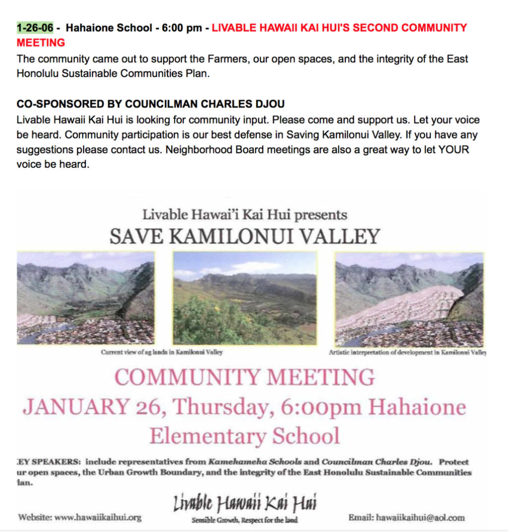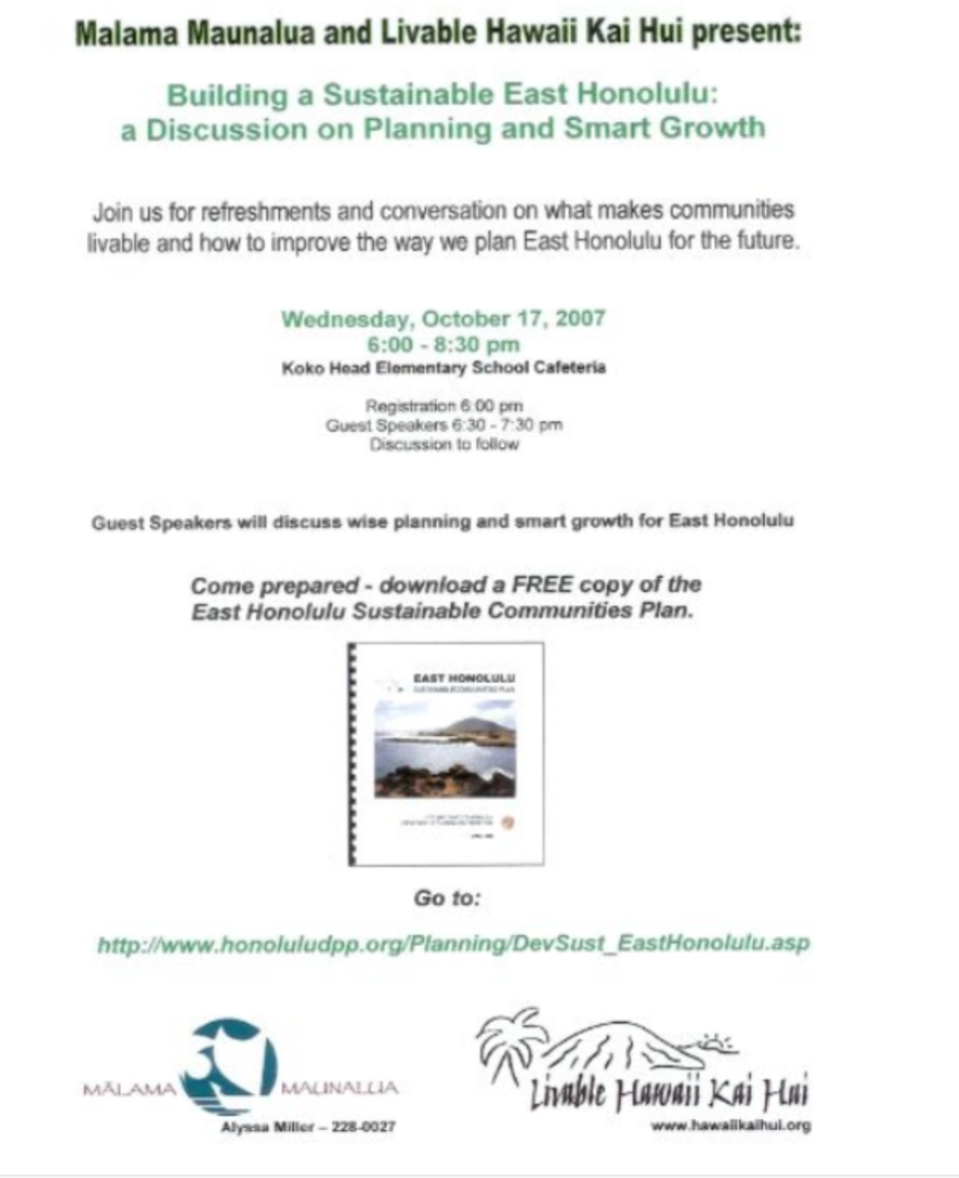 Additional open conversation will include past and future efforts to protect and preserve Ka Iwi, Kamilo Nui Valley and the East Honolulu Sustainable Communities Plan. Additional community subjects